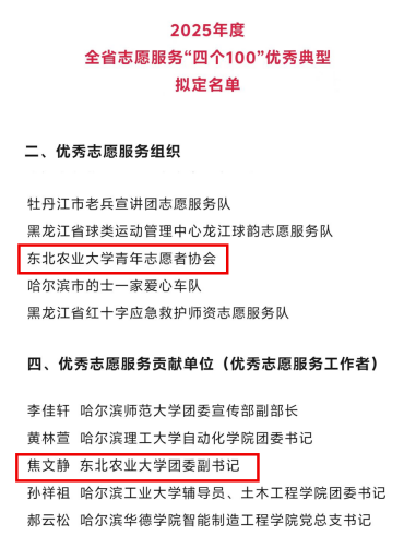 近日,在省委社会工作部、省委宣传部(省文明办)组织开展的“第四届黑龙江省新时代文明实践志愿服务项目大赛”和由省委社会工作部组织开展的2025年度全省志愿服务“四个100”优秀典型学习宣传活动中,我校喜获多项荣誉。