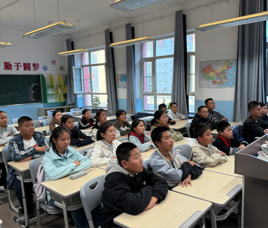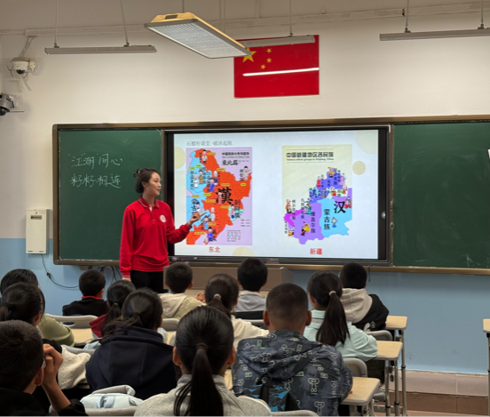 互动环节中,支教团成员以民俗文化为切入点,为同学们介绍东北二人转、新疆麦西来甫的歌舞特色以及东北铁锅炖、新疆手抓肉的饮食风味,引导学生从文化差异中看见更深层的联系。在对不同地域文化的探讨中,让学生感受多元文化魅力,将“尊重差异、包容互鉴”的理念于互动中自然传递。