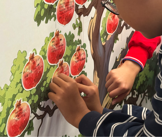 课程尾声,支教团成员结合石榴生动阐释“石榴籽紧密相依,恰似各民族同胞同心同行”的深刻寓意。随后组织学生在石榴贴纸上写下心愿,粘贴至“石榴树”背景板完成集体创作。这棵由一张张心愿贴组成的“石榴树”,在学生心中绘就了一幅由情感与认同联结的中华民族共同体情感地图。