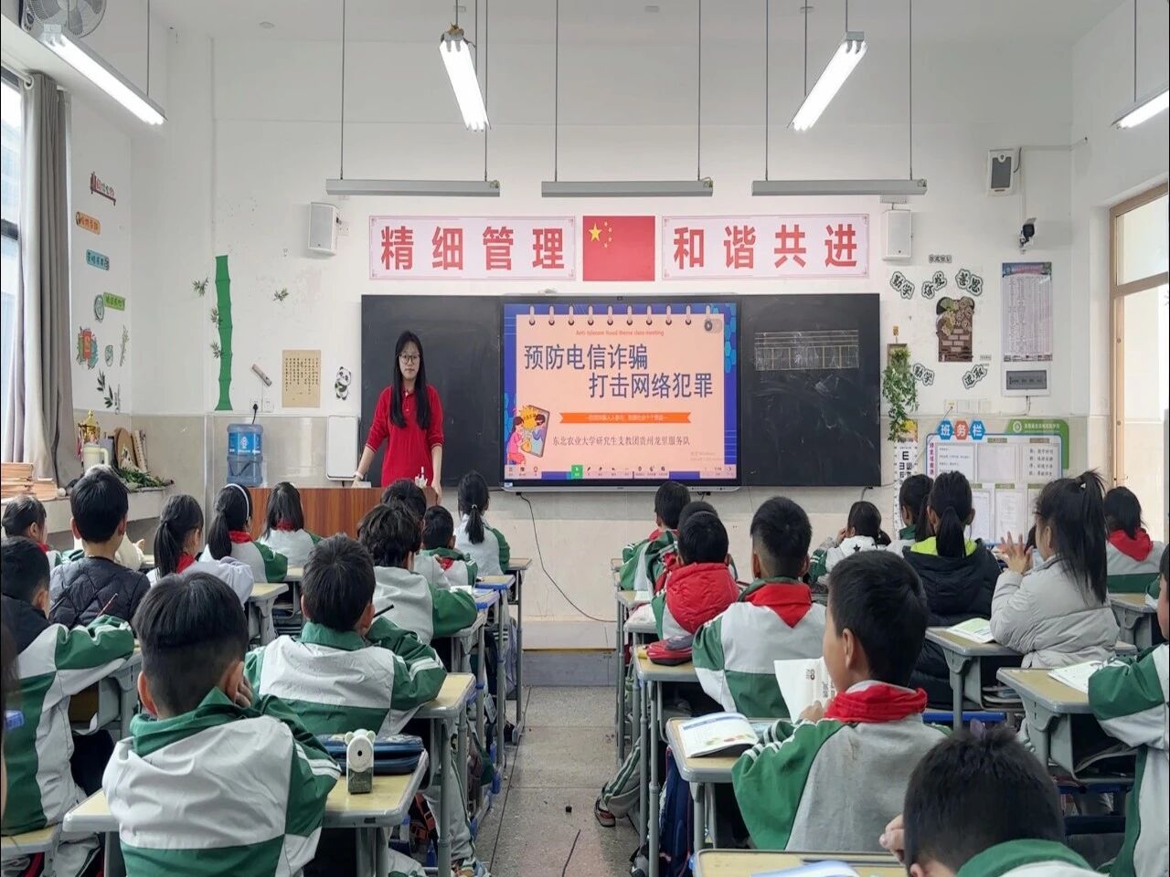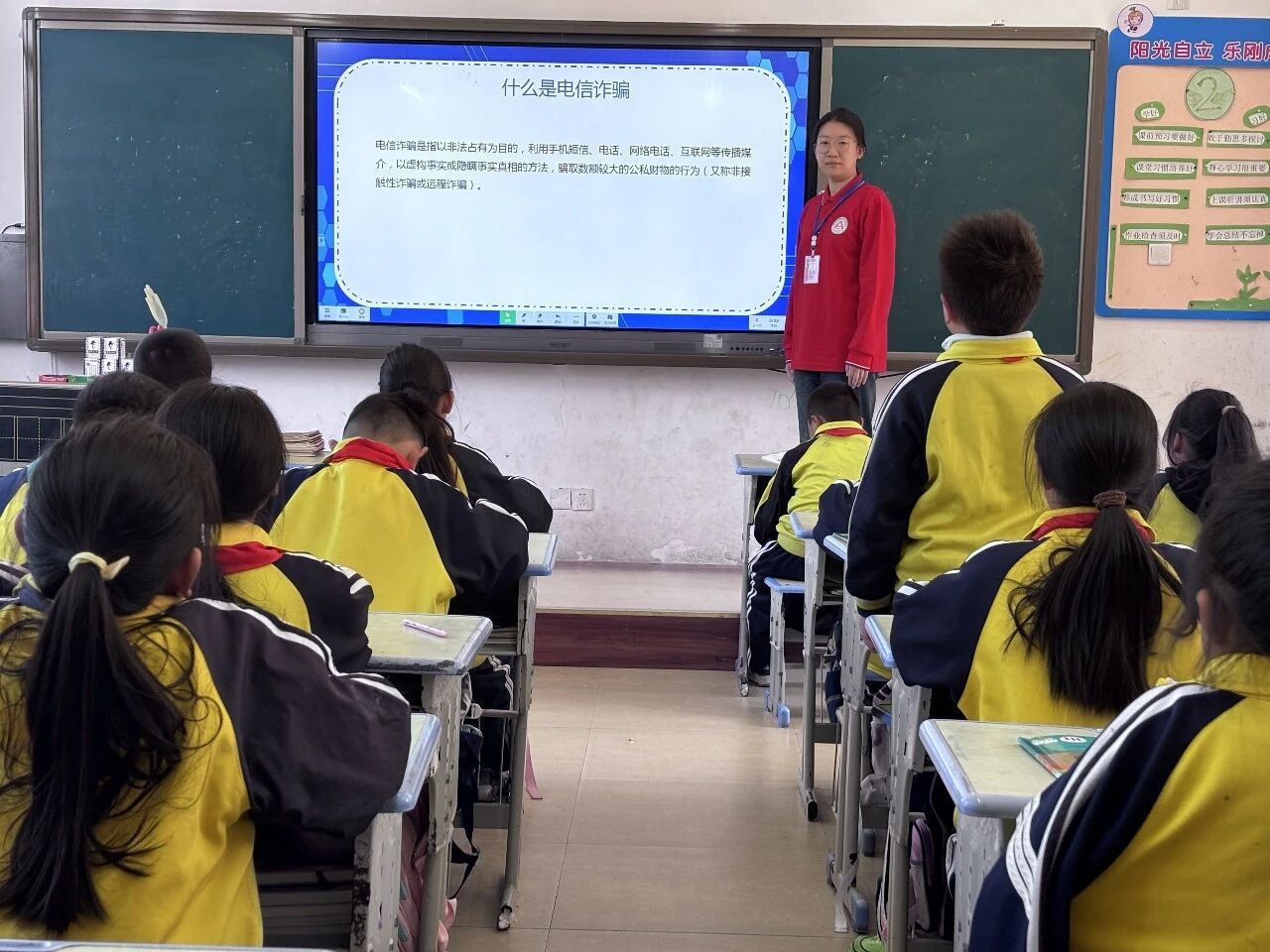 在宣讲环节,支教团志愿者结合中小学生认知规律,针对未成年人网络使用频繁、防范意识薄弱、易被游戏返利、冒充师长等骗局诱导的特点,把专业法律知识与防骗技巧转化为通俗易懂、好记实用的课堂内容。以主题班会、互动课堂为载体,通过案例剖析、趣味问答、风险场景拆解等形式,引导同学们牢记“不轻信、不透露、不转账、遇困先找家长老师”的核心准则,手把手教会大家识别诈骗套路、掌握求助与止损方法。